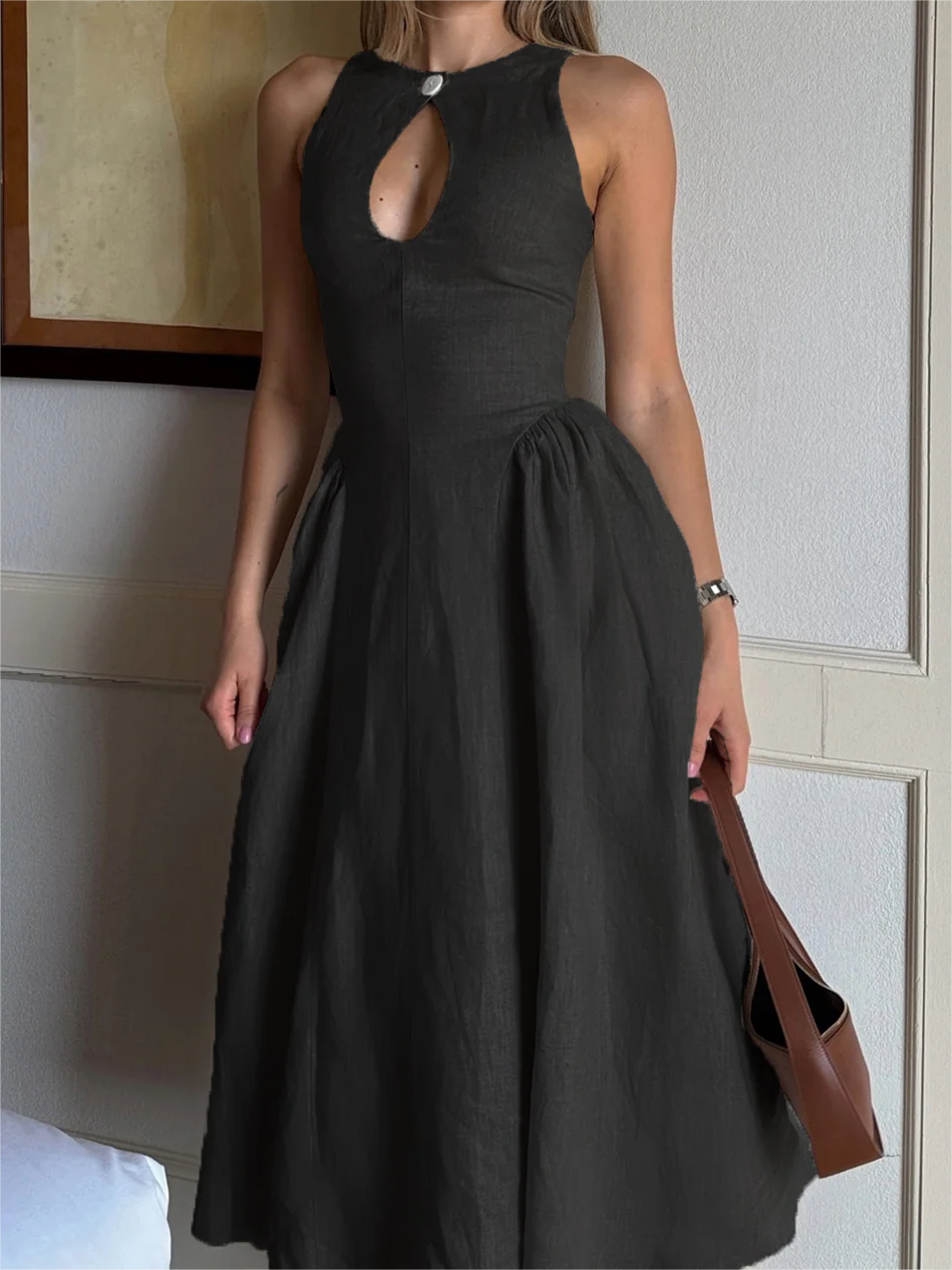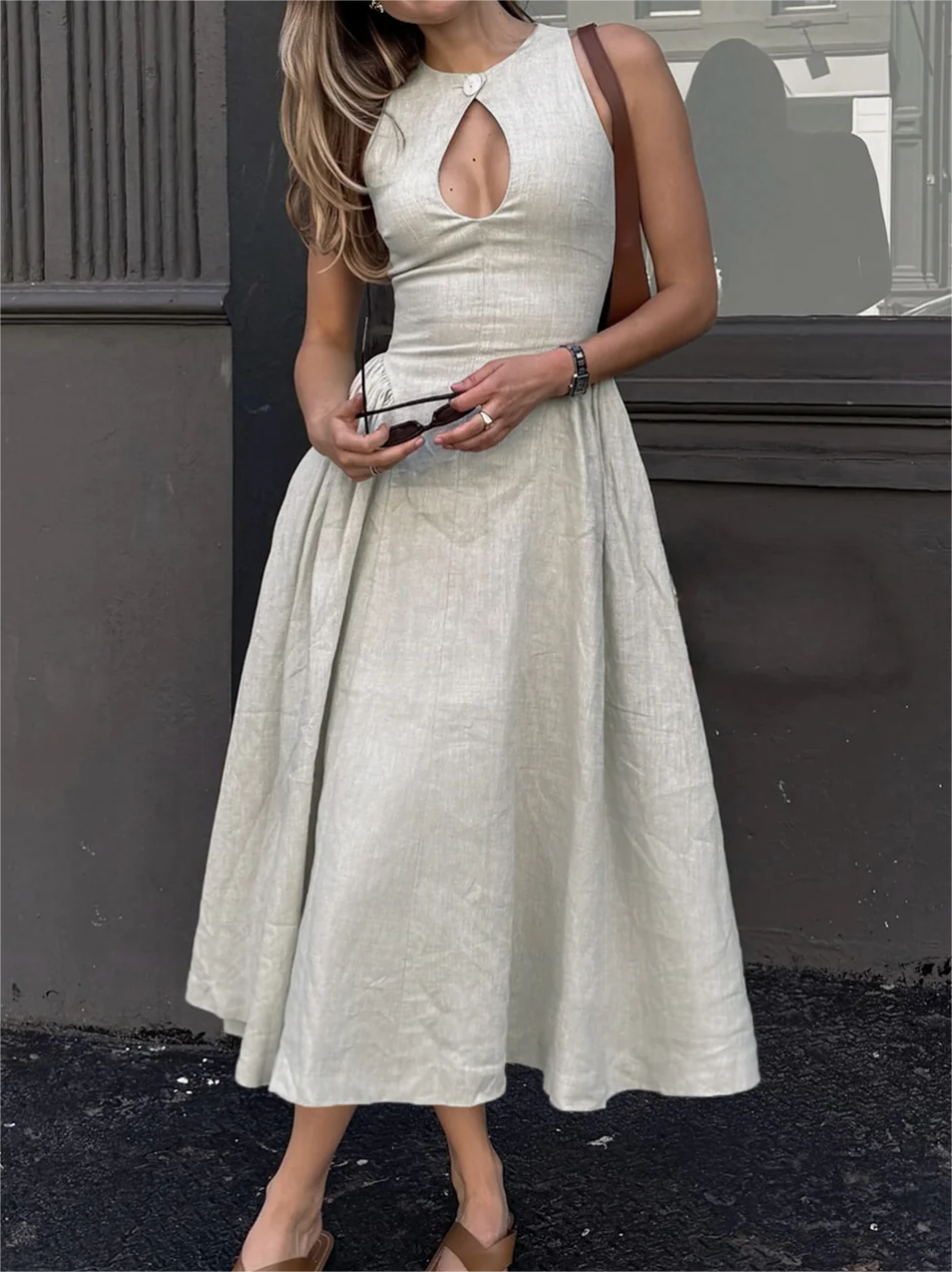 Cotton & Linen Pleated Cutout Long Dress 52973560