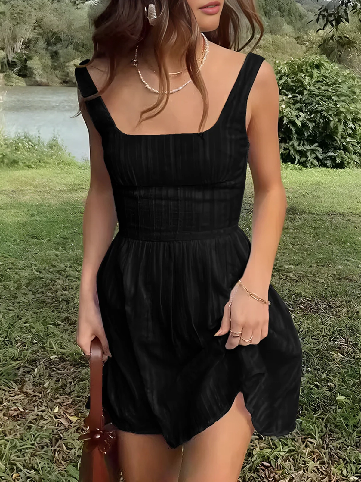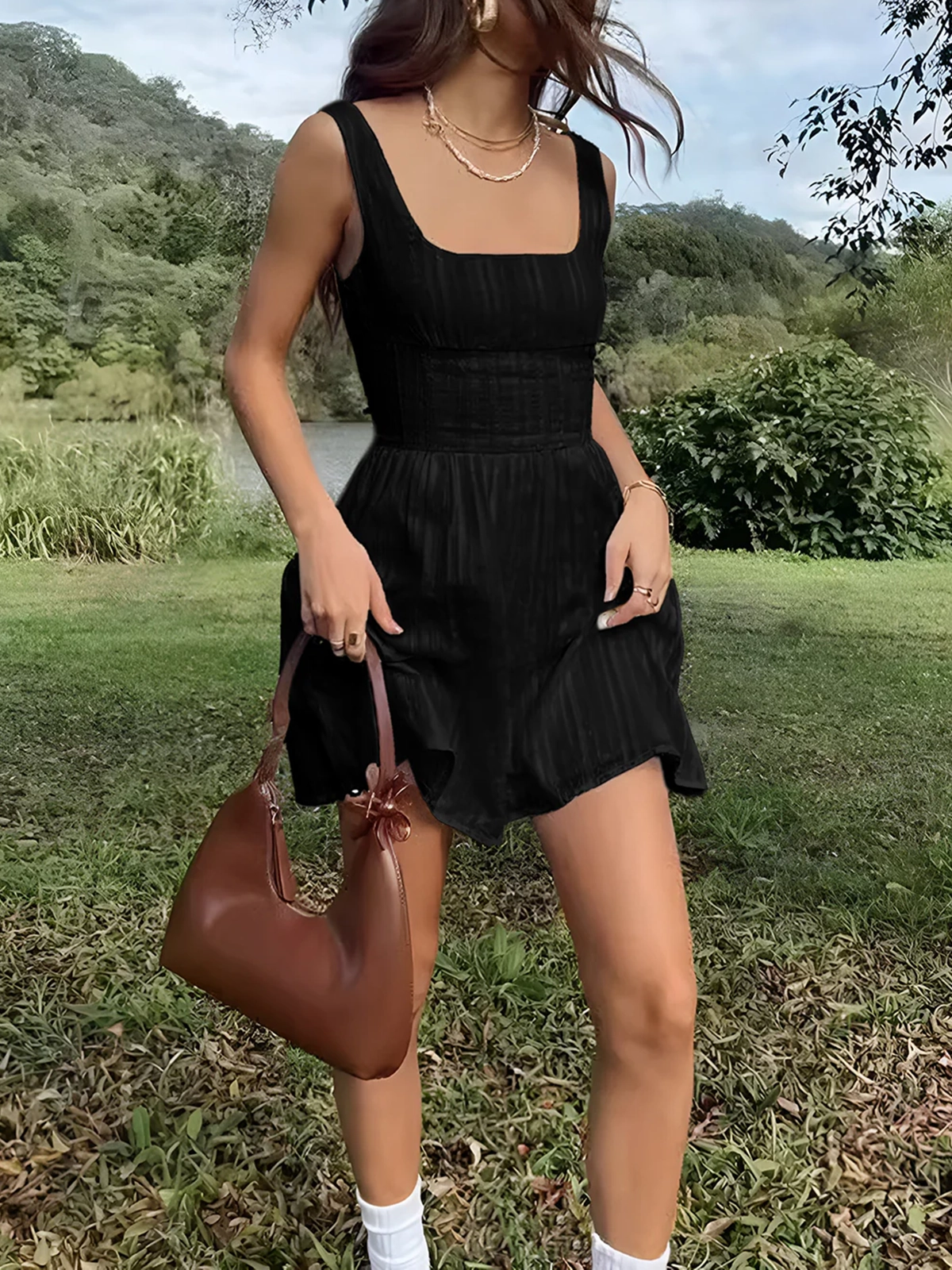 Cotton Blend Solid Square Neckline Short Dress 52973870