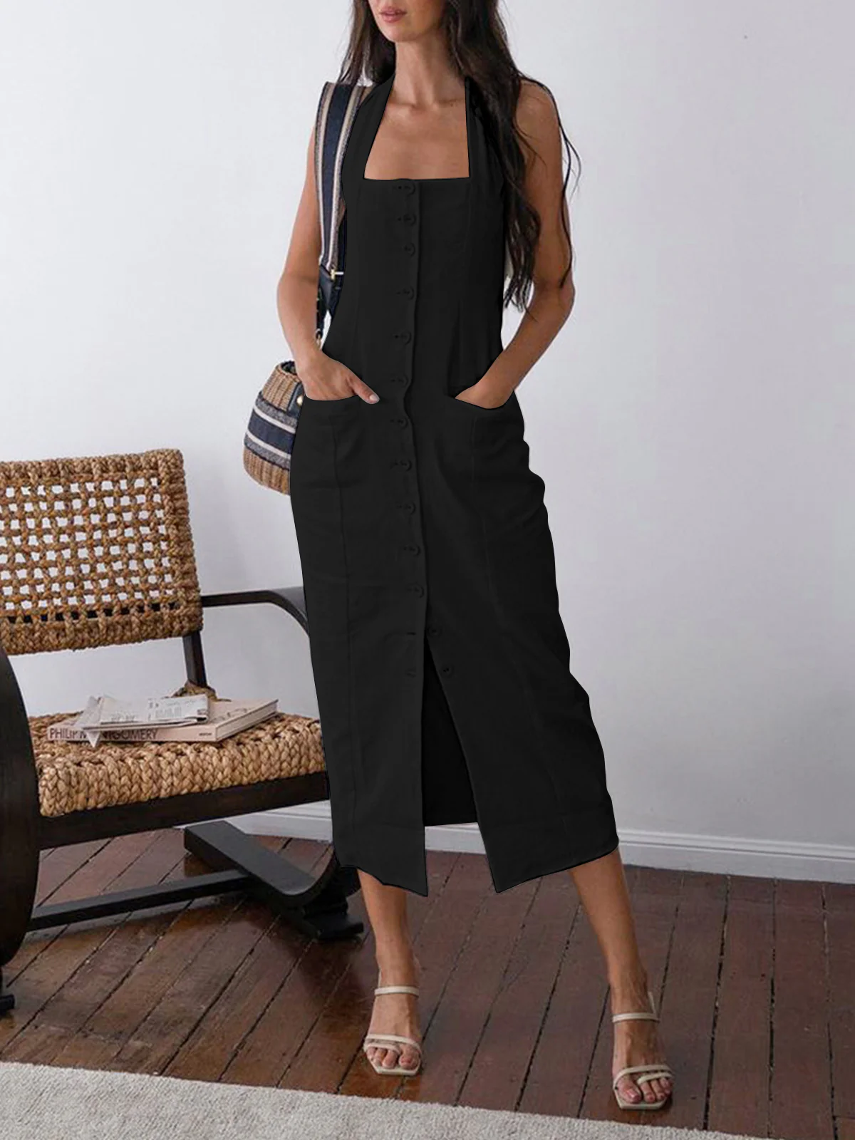 Tied Halter Open Back Cotton Linen Midi Dress 52973765